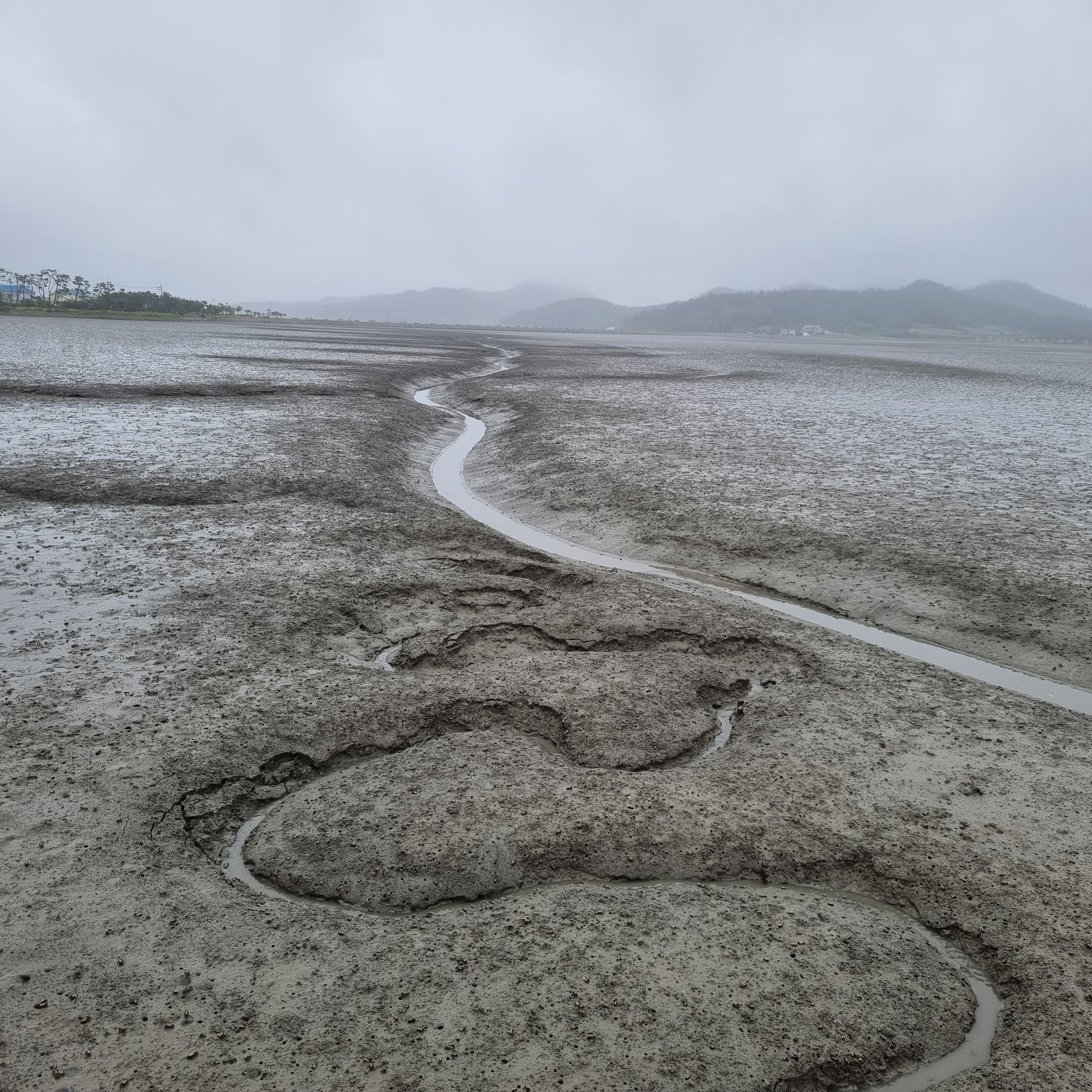 기다긴 뻘은 혈관처럼 굽이치는 골이 파여있다.