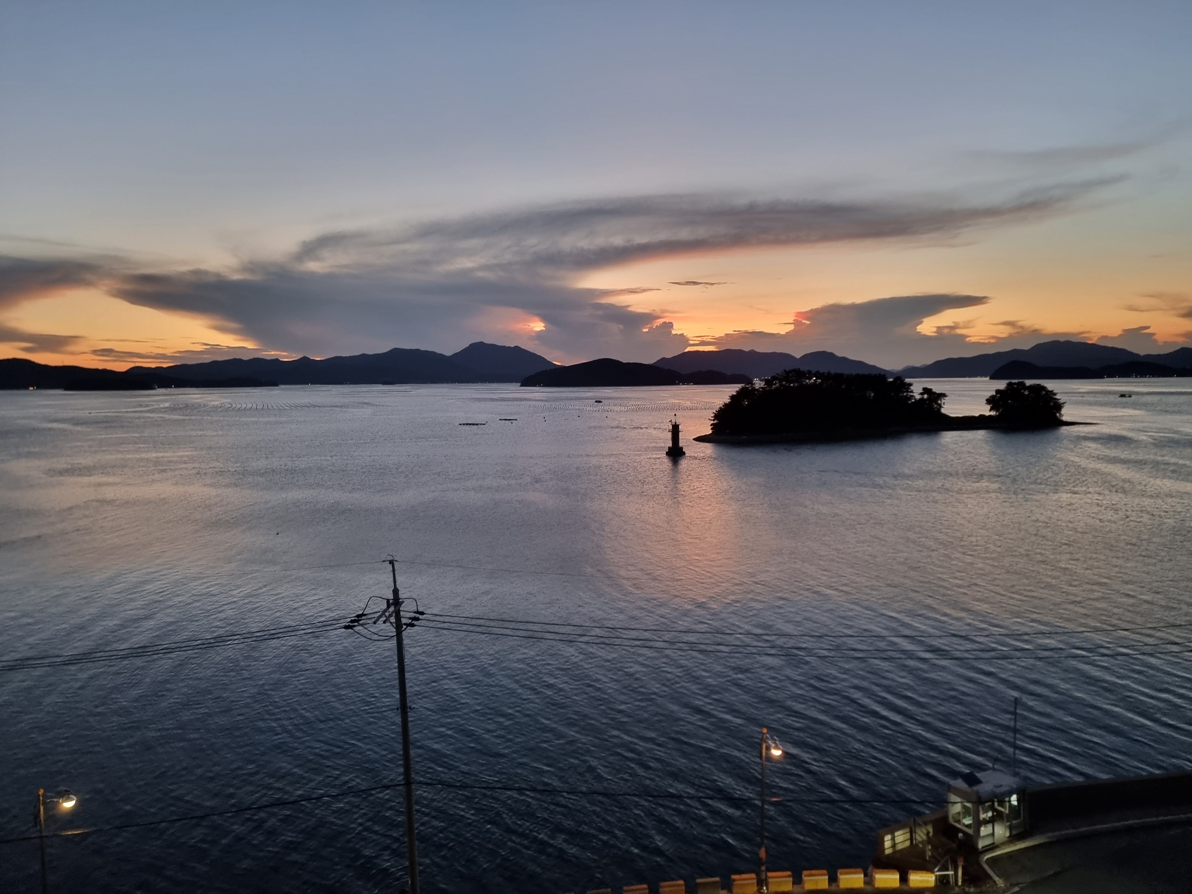숙소의 창밖으로 보이는 운치있는 낙조.